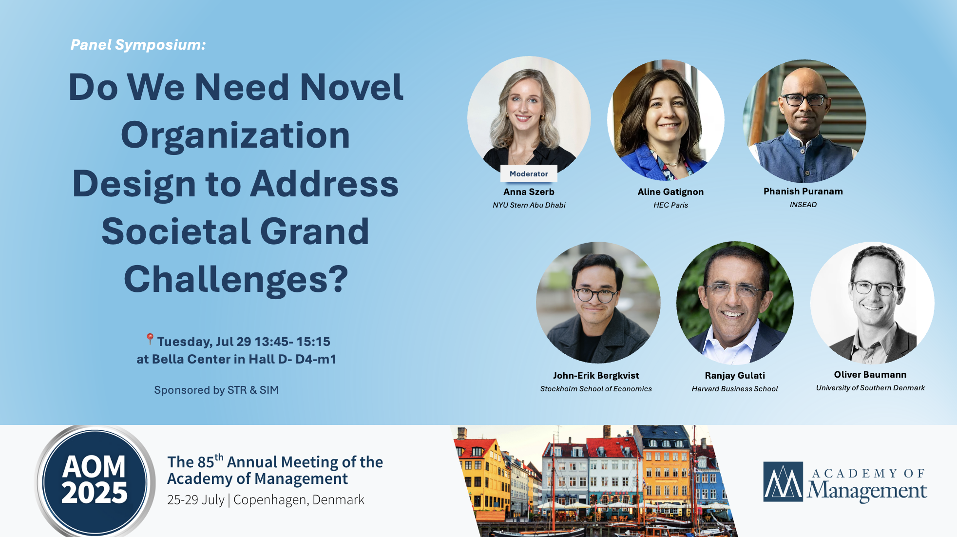 This panel symposium brings together Phanish Puranam (INSEAD), Aline Gatignon (HEC Paris), Anna Szerb (NYU STERN), Ranjay Gulati (Harvard Business School), Oliver Baumann (University of Southern Denmark), and John-Erik Bergkvist (Stockholm School of Economics) for an interactive discussion on a pivotal question: Is novel organization design truly necessary to tackle societal grand challenges? The panel symposium is sponsored by AOM STR & SIM.