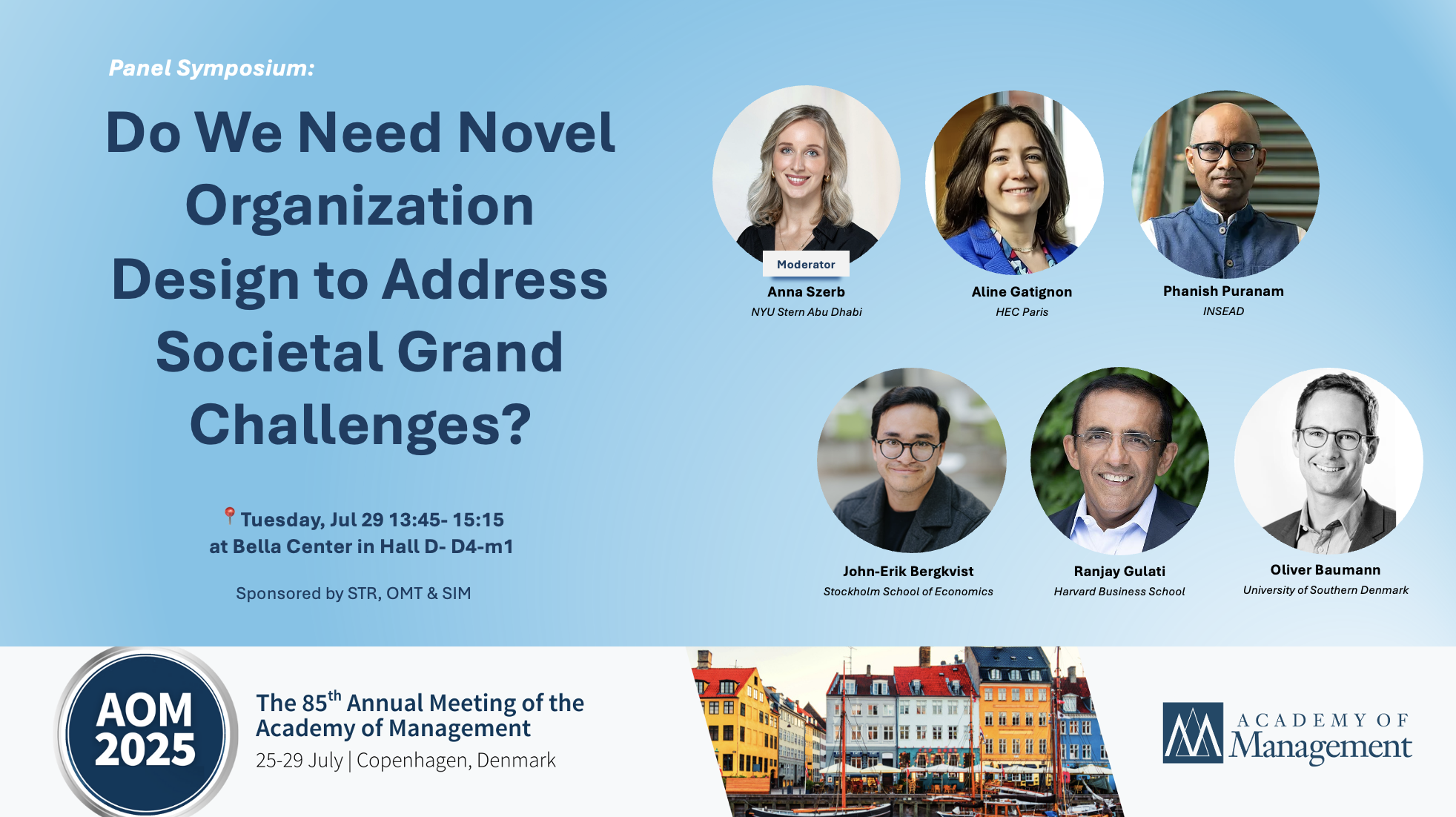 This panel symposium brings together Phanish Puranam (INSEAD), Aline Gatignon (HEC Paris), Anna Szerb (NYU STERN), Ranjay Gulati (Harvard Business School), Oliver Baumann (University of Southern Denmark), and John-Erik Bergkvist (Stockholm School of Economics) for an interactive discussion on a pivotal question: Is novel organization design truly necessary to tackle societal grand challenges? The panel symposium is sponsored by AOM STR Division, AOM OMT Division & AOM SIM Division