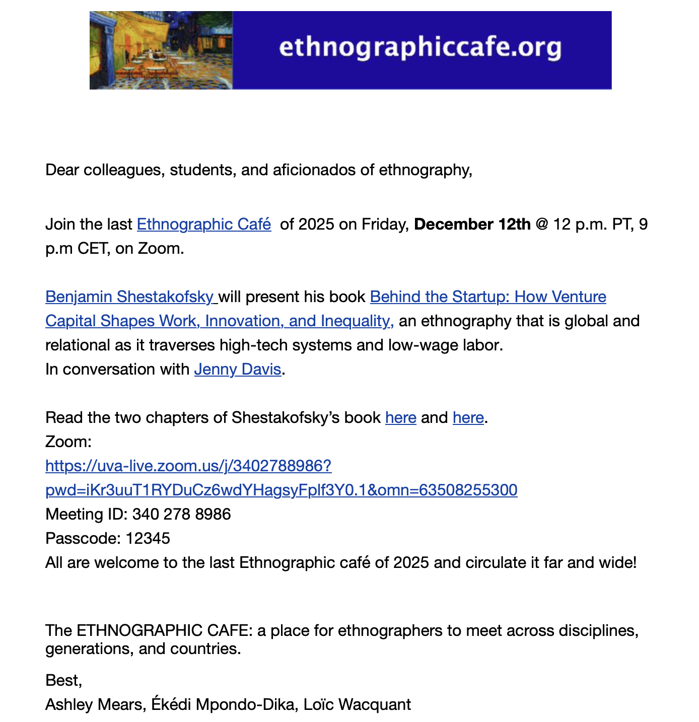 Join The Ethnographic Cafe Dec 12 for Behind the Startup: How Venture Capital Shapes Work, Innovation, and Inequality
