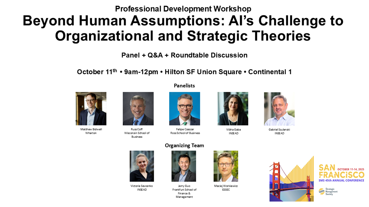 The workshop will consist of two parts. In Part 1, five outstanding panelists (Matthew Bidwell, Russ Coff, Felipe Csaszar, Vibha Gaba, and Gabriel Szulanski) will share their perspective on how AI challenges or reshapes key theories in strategy and organization research. Following their presentations, the panelists will engage in a moderated discussion and Q&A.