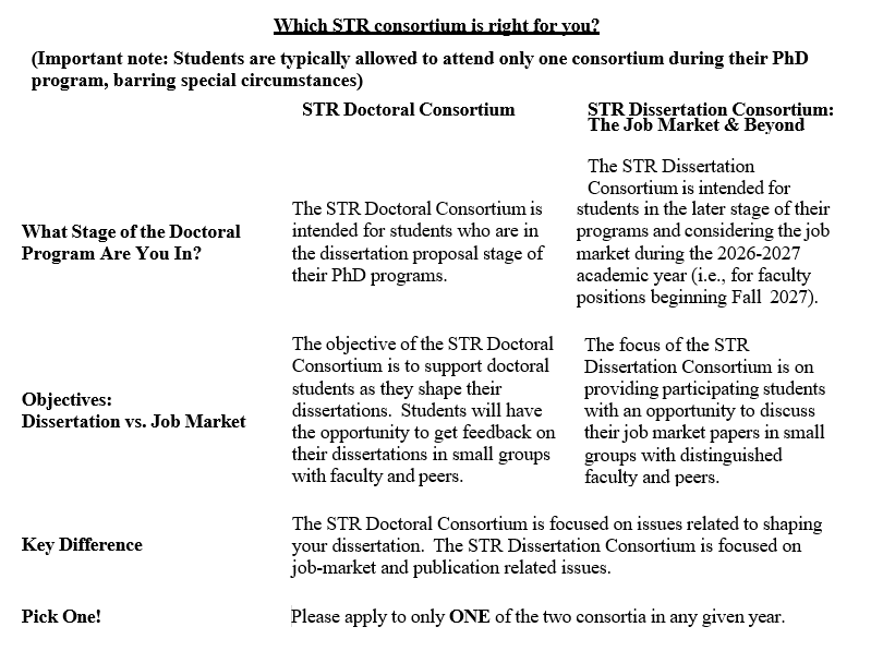 Priority for admission to the 2026 Dissertation Consortium will be given to students who: (1) have completed drafts of their job market papers, and (2) have not previously attended the STR Doctoral Consortium. However, any doctoral student who is considering entering the job market and graduate during the 2026-2027 academic year (and who is not applying to the 2026 Doctoral Consortium) may apply. We intend to cover how to maneuver the challenges and considerations of the job market, crafting your elevator pitch, and also focus on providing developmental feedback for the publication process on student job market papers.
